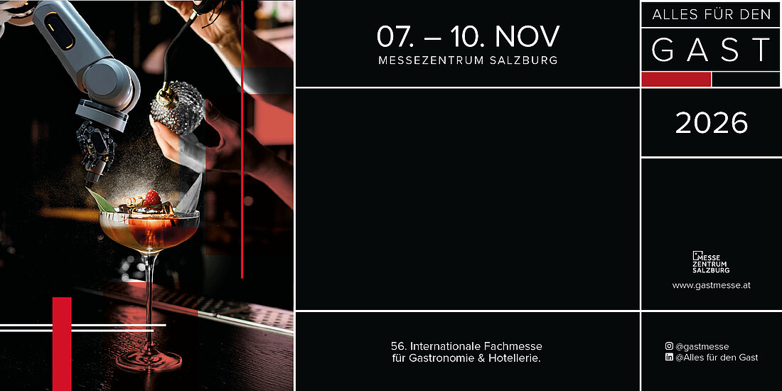 Von 7.-10. November 2026 lädt die „Alles für den Gast“, Österreichs größte Fachmesse für Gastronomie und Hotellerie, erneut ins Messezentrum Salzburg. Seit über fünf Jahrzehnten ist sie der zentrale Treffpunkt der Branche im Donau-Alpen-Adria-Raum – ein Ort, an dem Innovation, Austausch und persönliche Begegnung im Mittelpunkt stehen.