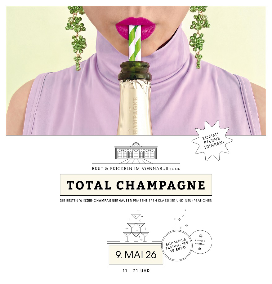 Einen Tag vor Muttertag und dem Start des Eurovision Village findet im Zentrum Wiens wieder das Fest für Schampus-Kenner, -Liebhaber und alle, die neugierig genug sind, über den Glasrand hinauszuschauen, statt. Bei TOTAL CHAMPAGNE bringen innovative Champagner-Winzer aus Frankreich wieder ihre spannendsten und neuesten Kreationen nach Wien und schenken persönlich ein, was in ihren Kellern funkelt.