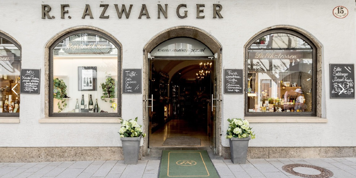 Hinter dem Azwanger-Genussreich in der Getreidegasse stehen die Schwestern Valerie Egelkraut-Kopp und Andrea Glück-Kopp, die in vierter Generation mit dem Azwanger-Betrieb aufgewachsen sind - der Sinn für Delikatessen und erlesene Weine wurde ihnen sozusagen in die Wiege gelegt. Das Sortiment umfasst unter anderem Spirituosen, Sekt, Champagner sowie heimische und internationale Weine. Neben österreichischen Spezialitäten wie Schokoladen, Marmeladen, Essigen, Ölen und Kaffees werden auch Delikatessen aus der ganzen Welt angeboten.