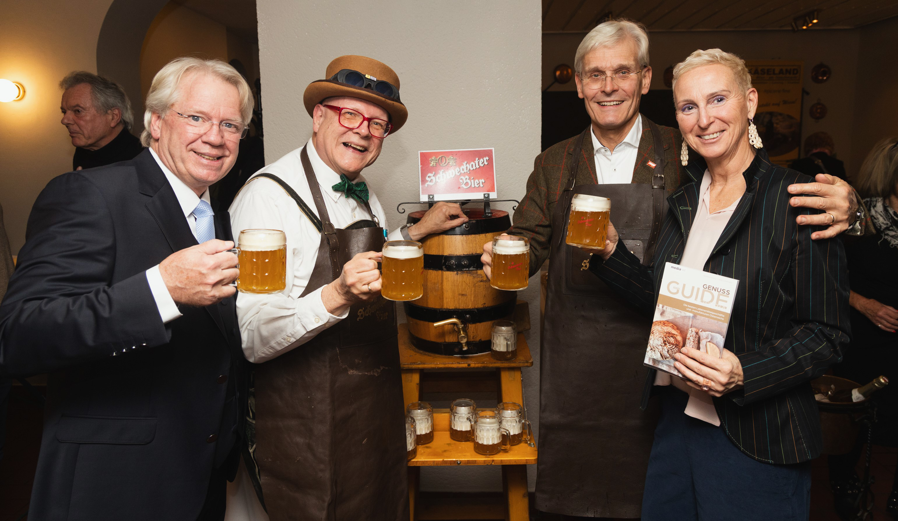 Die Herausgeber und Autoren Andrea Knura und Willy Lehmann präsentierten den druckfrischen Genuss Guide Austria 2026, ehrten die Award-Gewinner und luden gemeinsam mit Bierpapst Conrad Seidl zum stimmungsvollen Schwechater Bockbieranstich ins Wiener Restaurant Zum Leupold.