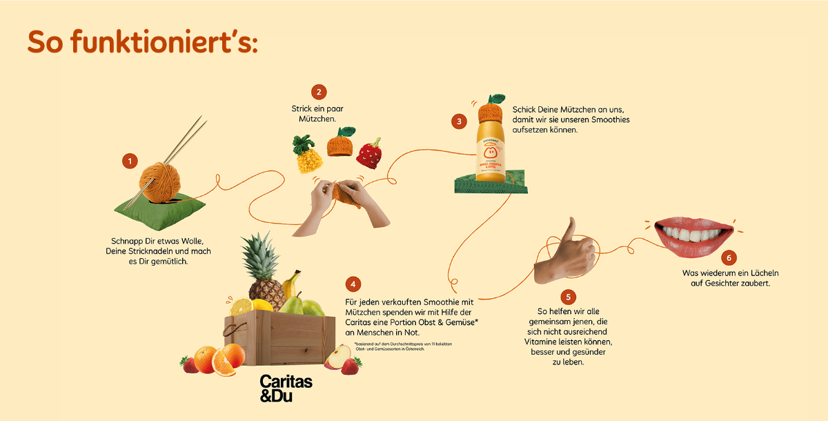 Mit jedem gestrickten Mützchen wird doppelt geholfen: Die innocent Smoothies bekommen eine kuschelige Kopfbedeckung und gemeinsam mit ihrem Partner Caritas spendet innocent für jede verkaufte Flasche mit Mützchen eine Portion Obst & Gemüse an Menschen in Not. An mehr als 1.600 Standorten in ganz Österreich ist die Caritas für Menschen in Not da. „Wir freuen uns sehr über die gemeinsame Aktion. Sie ist ein schönes Zeichen der Solidarität und zeigt, dass Stricken weit mehr kann, als nur warm zu halten. Gemeinsam können wir Gutes bewirken und Menschen unterstützen, die weniger haben. Und in diesem Fall zählt wirklich jede Masche: Jedes kleine Mützchen bringt nicht nur Farbe und Freude auf die Flaschen, sondern auch Hilfe für Menschen in Not. Ich bin überzeugt, dass viele mit Herz, Wolle und Begeisterung mitstricken werden – ob zu Hause, im Freundeskreis oder gemeinsam mit Freiwilligen der Caritas. Vielen Dank schon jetzt dafür.“, so Nora Tödtling-Musenbichler, Präsidentin der Caritas Österreich.