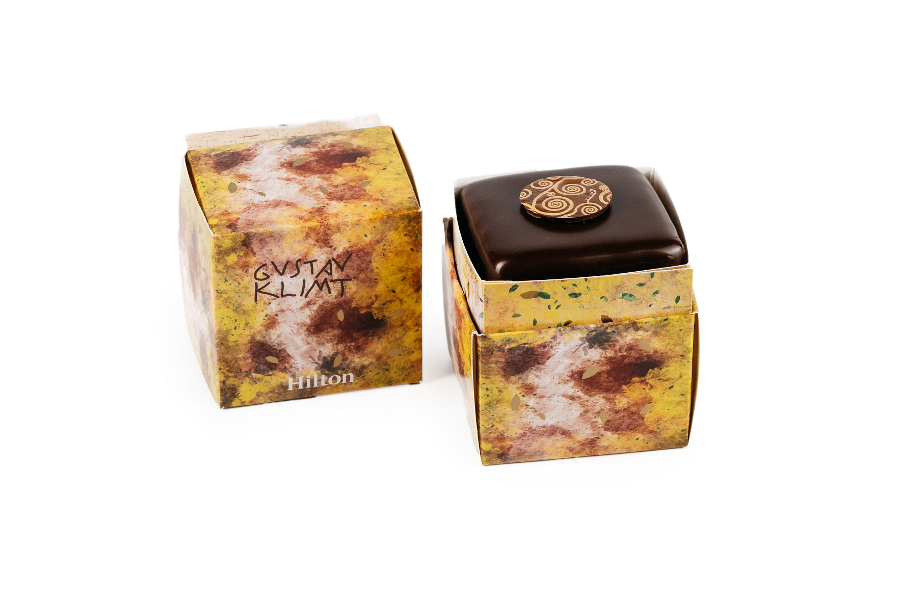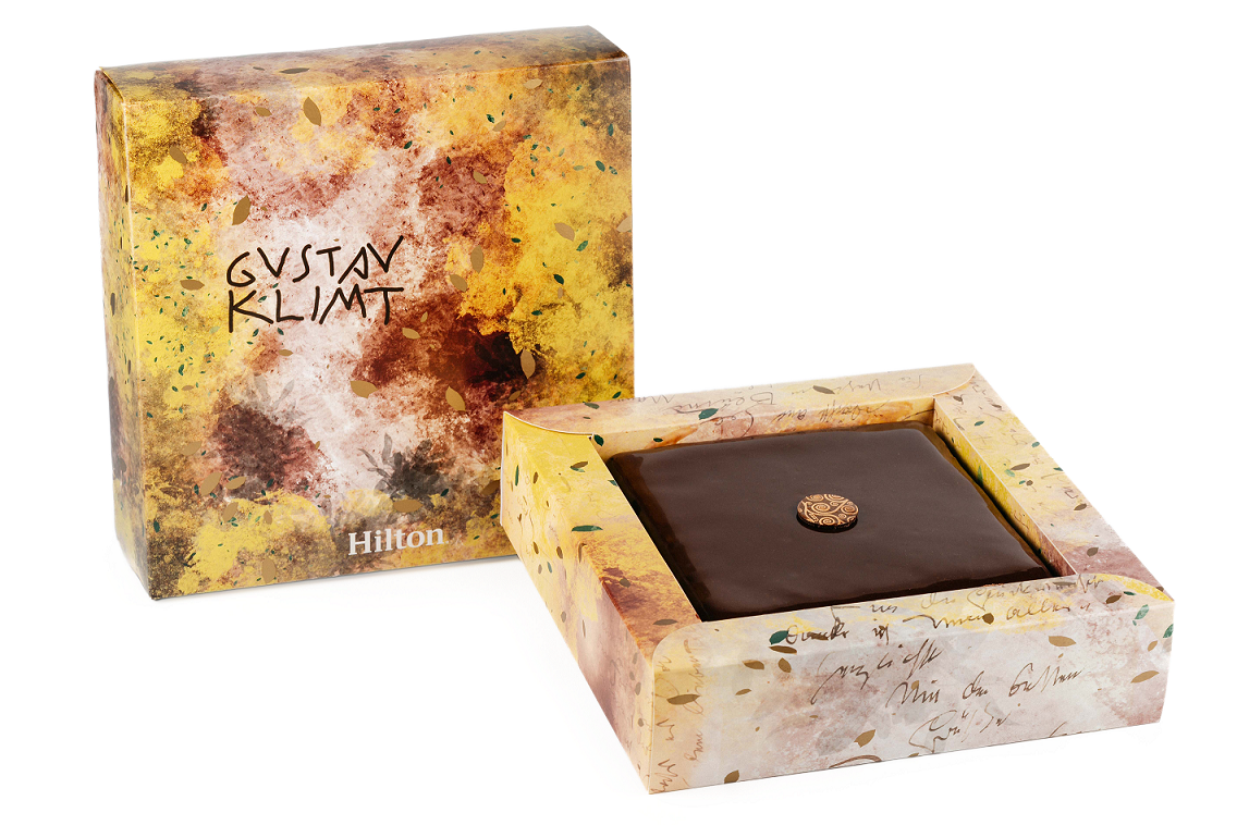 Die Klimt Torte in der neuen Verpackung ist ab sofort in zwei Größen in den drei Wiener Hilton Hotels & Resorts erhältlich.